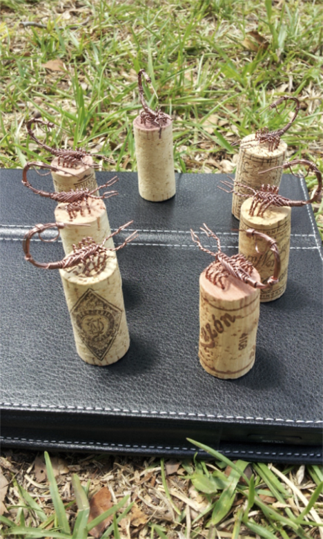 Full disclaimer: I created some insects based on standard templates found online (shock!). To make them more challenging and a bit unique, I scaled them down to nearly impossible levels. The scorpions are mounted on standard-sized wine corks.